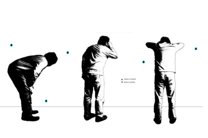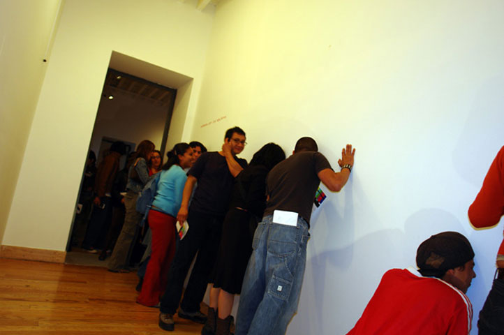 En la primera sección de agujeros se sitúa la acción de mirarse mirando. Juego que es permitido por la presencia de una cámara de vigilancia frente a la pared de los agujeros. Está permite que se “proyecte” al espectador en su actitud de mirarse y este pueda observarse haciéndolo.