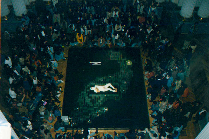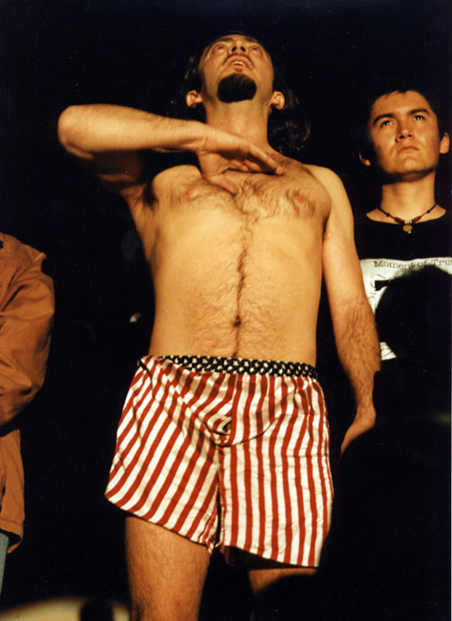 During the first action the artist is left in trousers that can be seen tailored as an American flag. While being half-naked, a feminine voice in off says in Spanish.