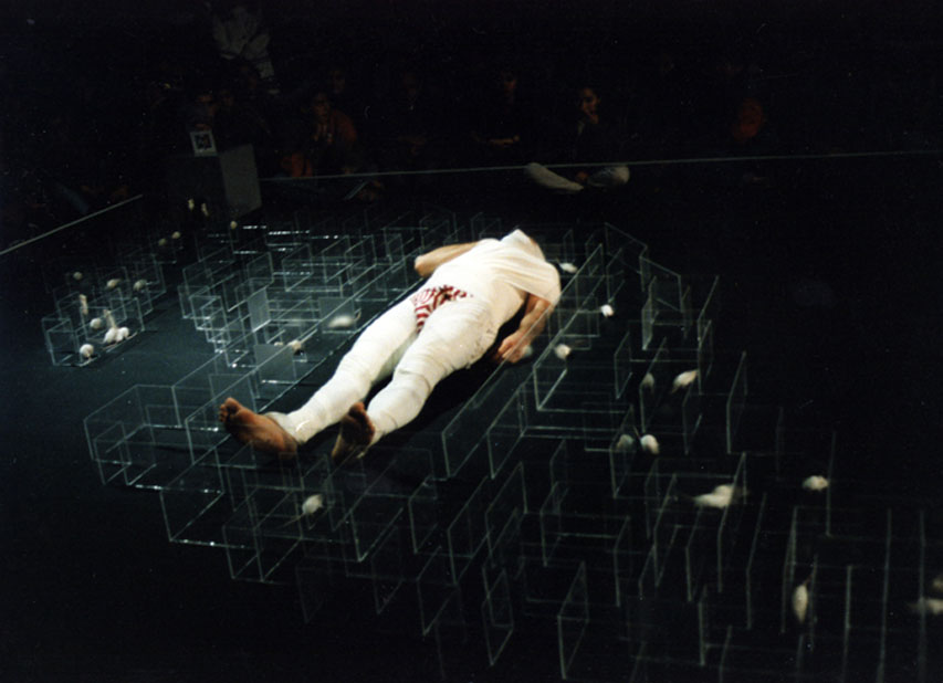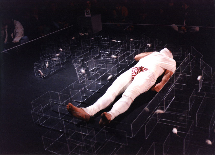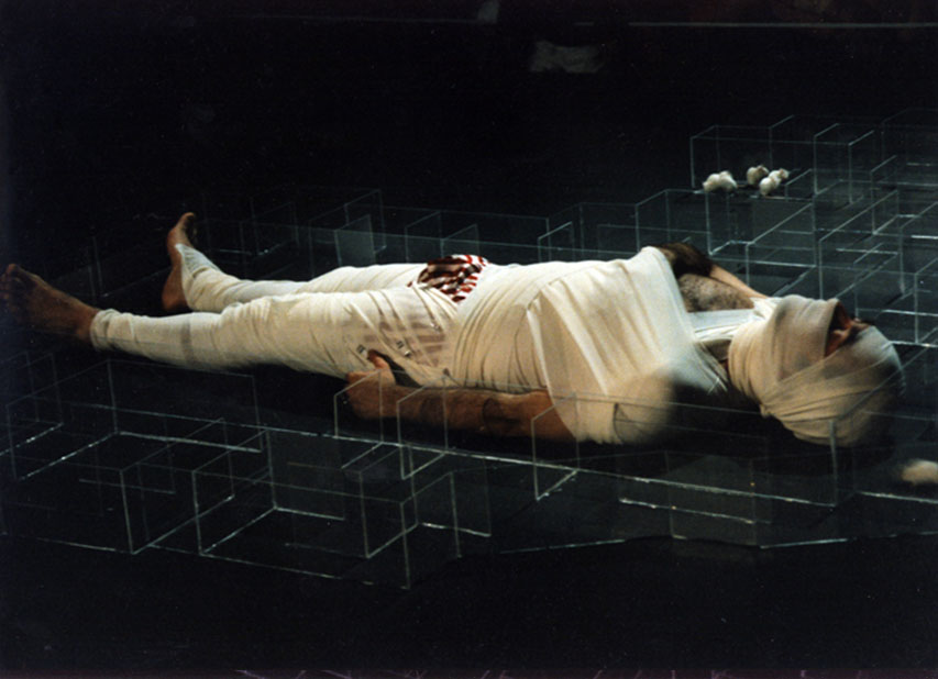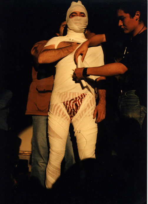 The audience is asked to immobilize the artist with white color bandage.