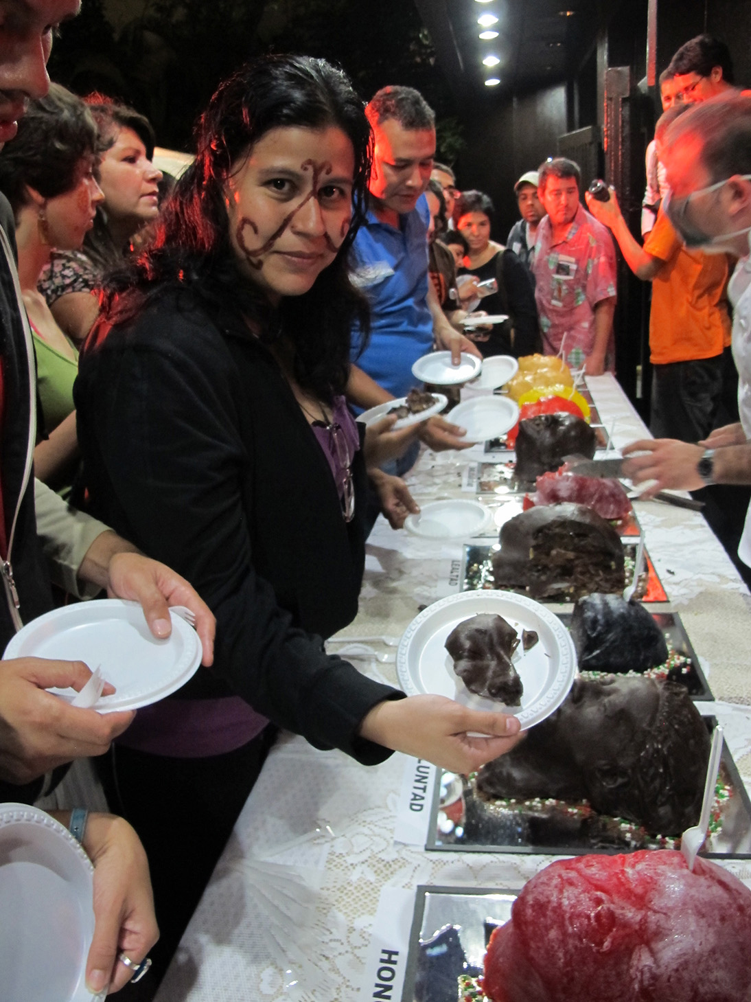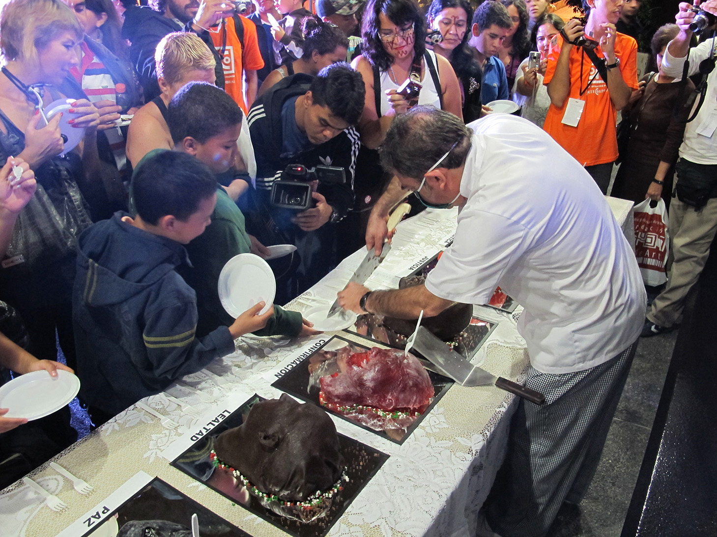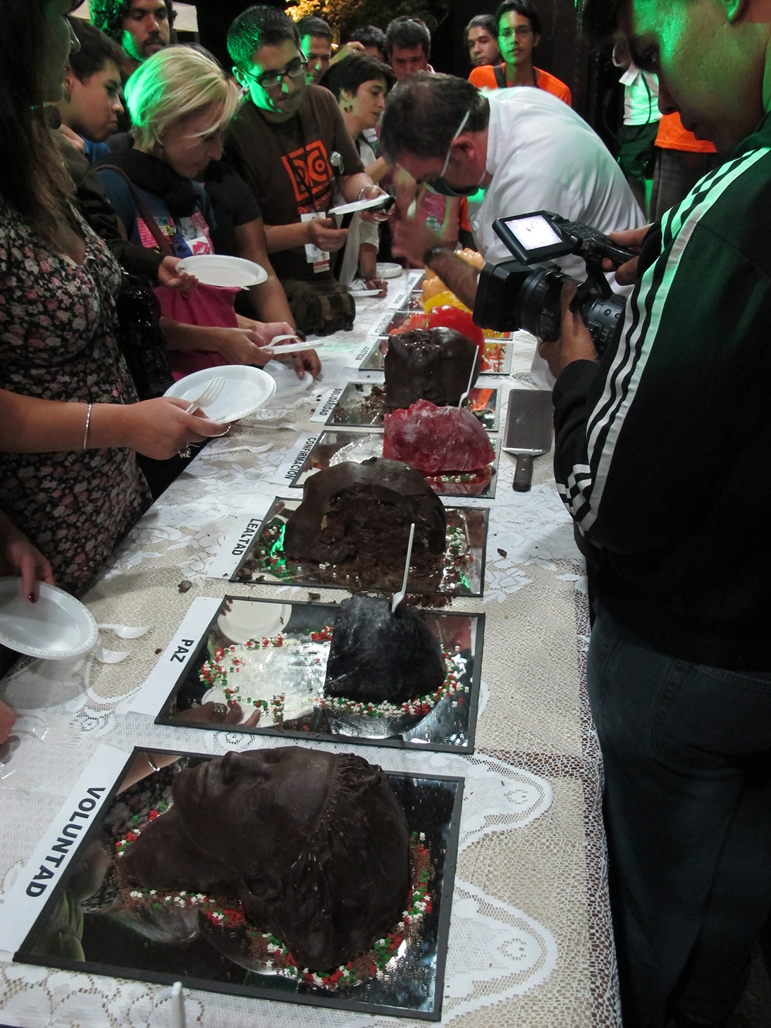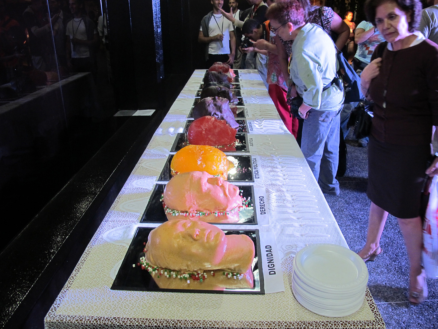 Twelve cakes were prepared in the form of severed heads, each head representing one of the values lost to extreme capitalism, such as: Loyalty, Dignity, Ethics, Justice, Peace, Solidarity, Trust...