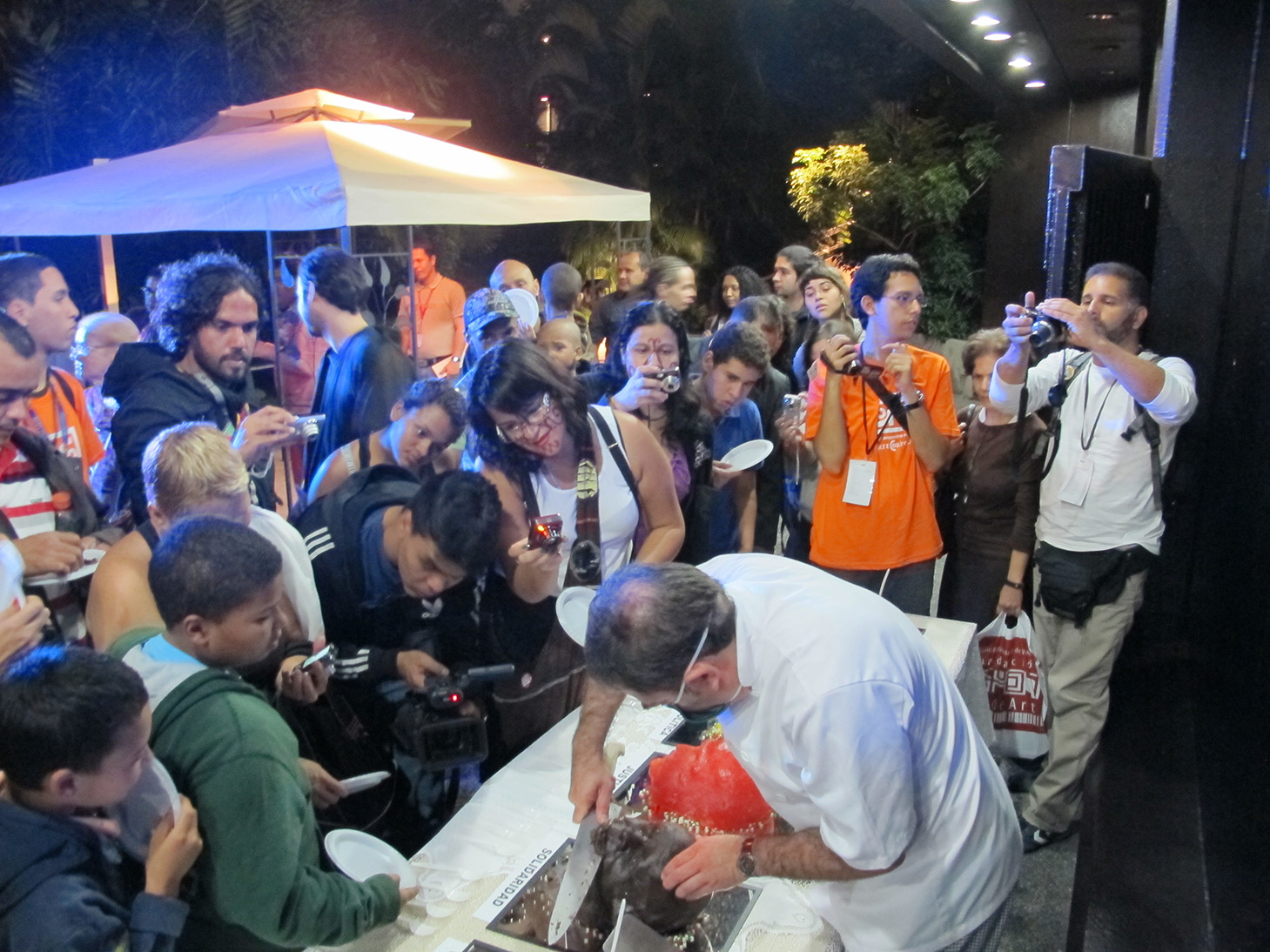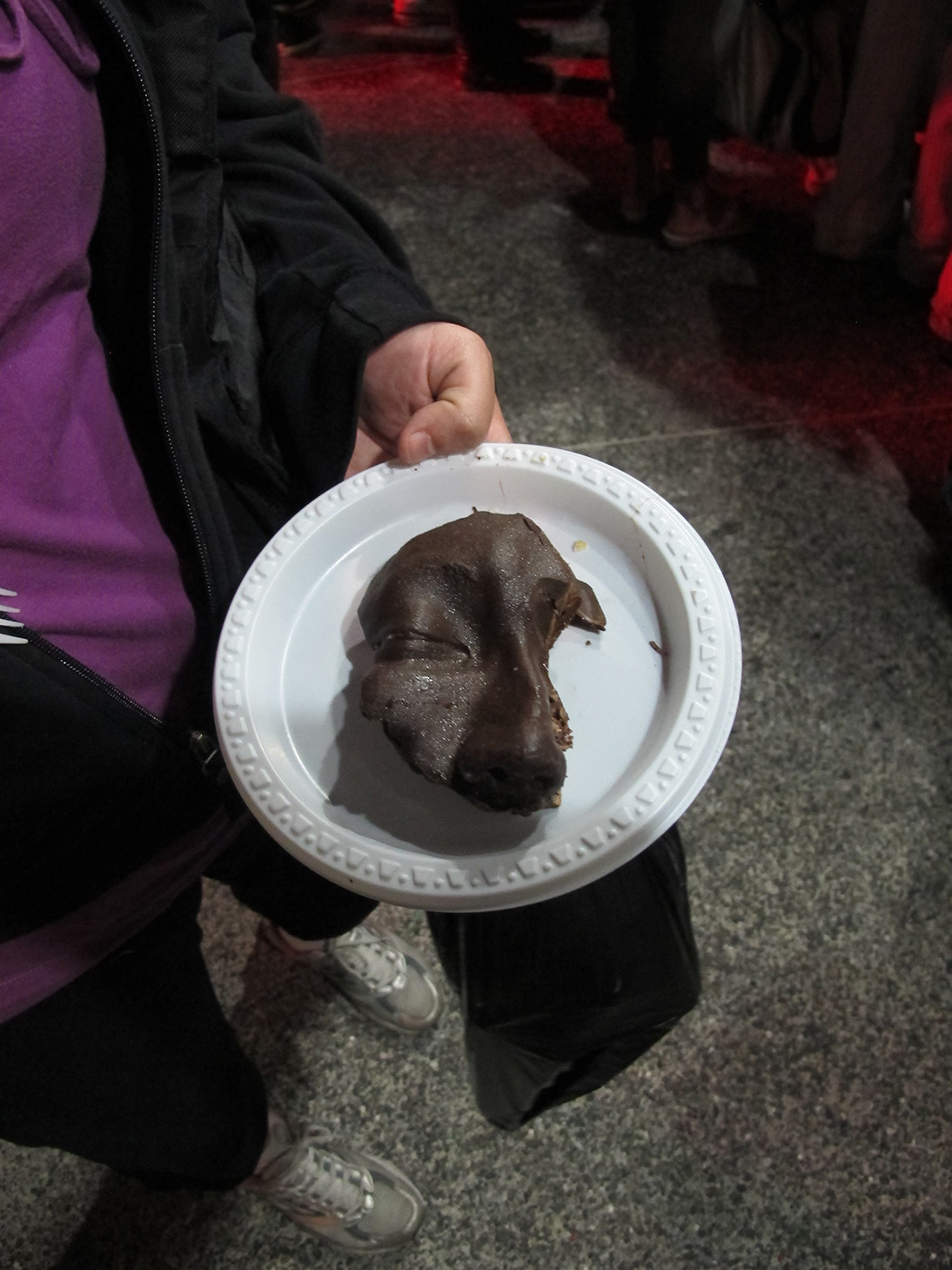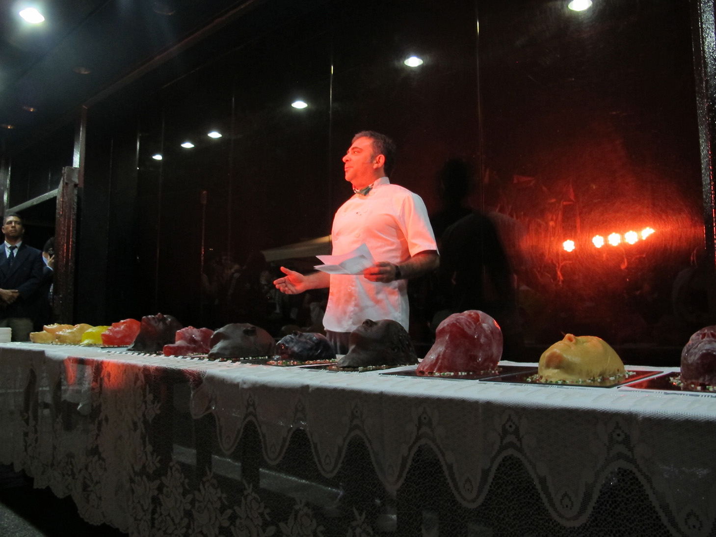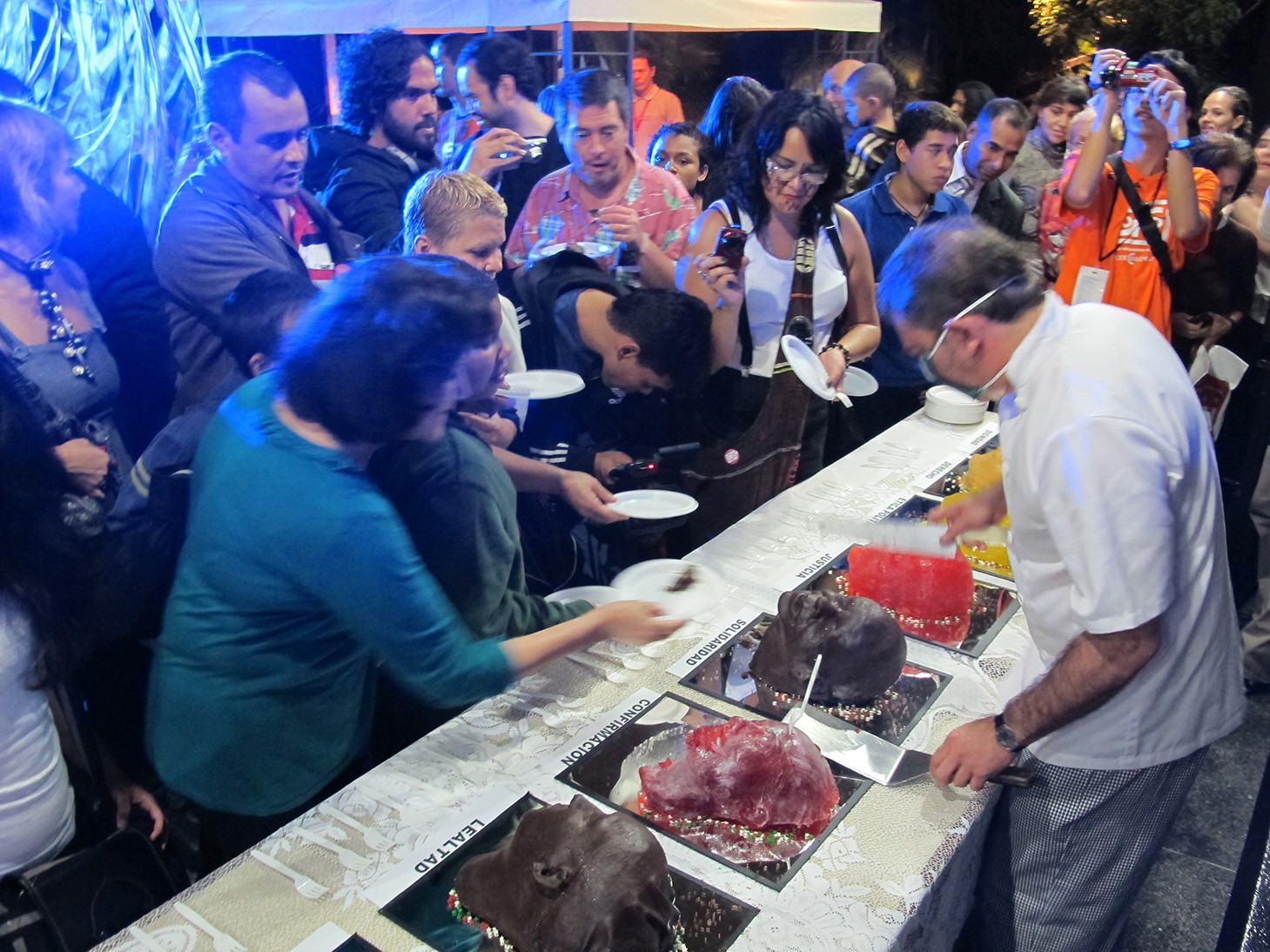 Twelve cakes were prepared in the form of severed heads, each head representing one of the values lost to extreme capitalism, such as: Loyalty, Dignity, Ethics, Justice, Peace, Solidarity, Trust...
