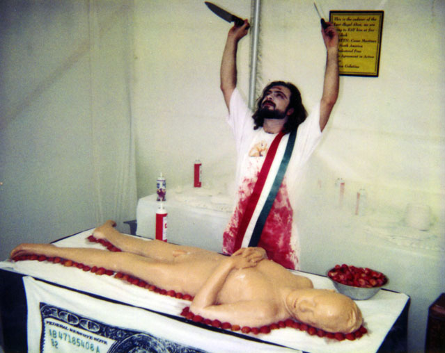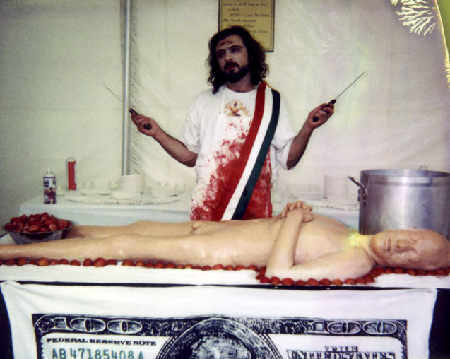 7th Annual Cherry Creek Arts Festival, PerforMANce-dinner “The North American Free Tanga Puesto over America Ge-Latina”. Denver, Colorado, USA, 1997. Curatorship by Guillermo Gómez Peña and Lorena Wolffer.