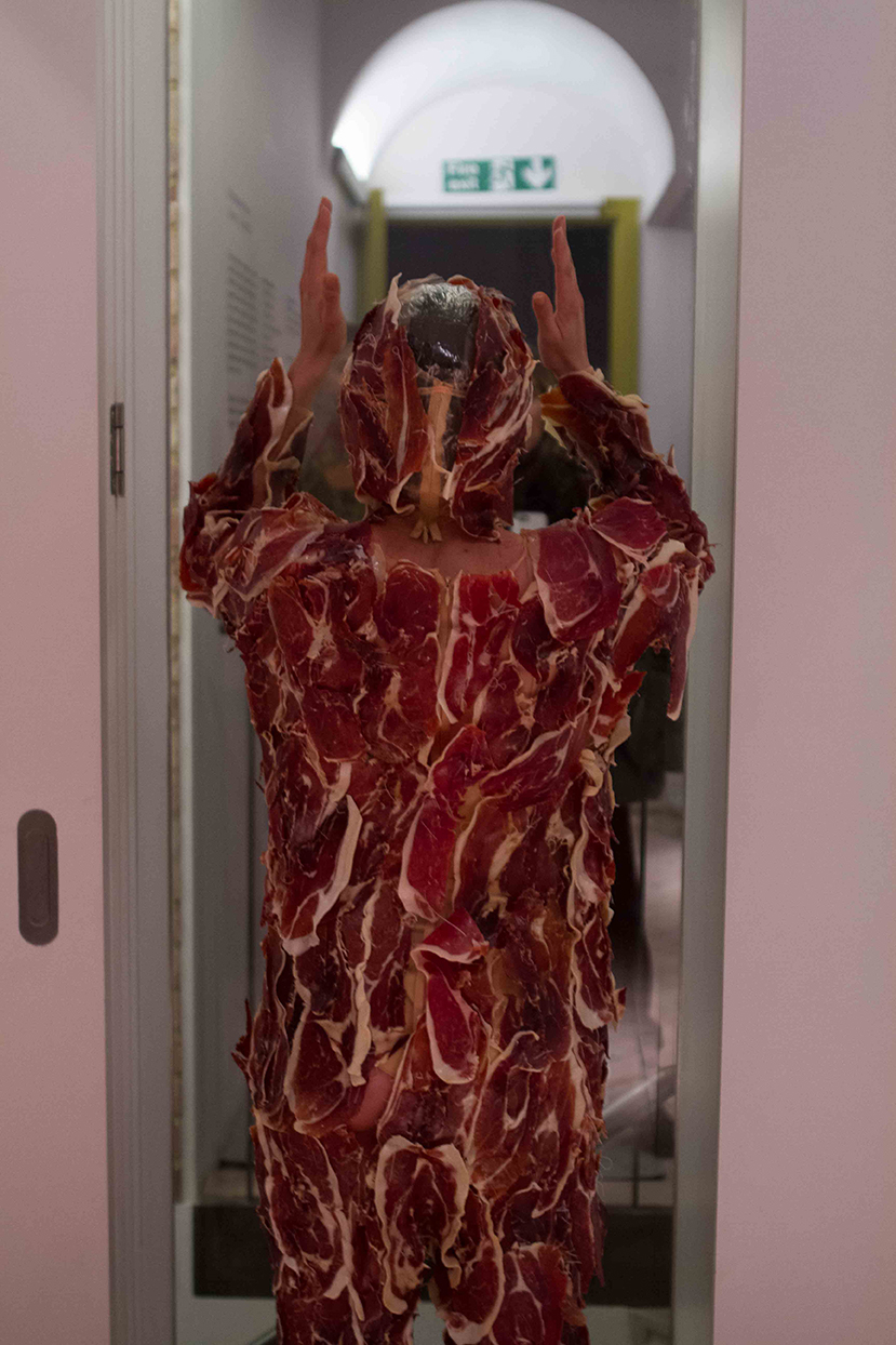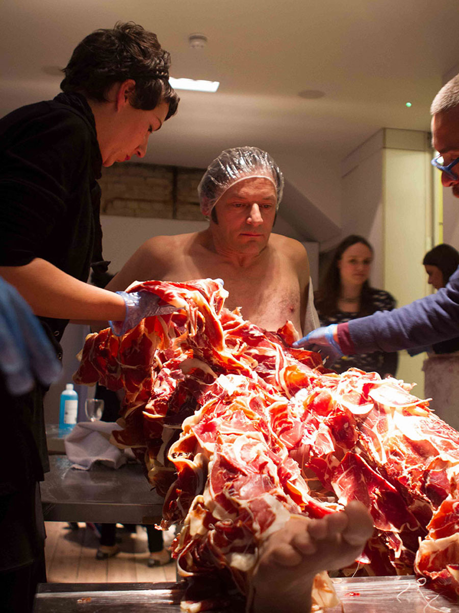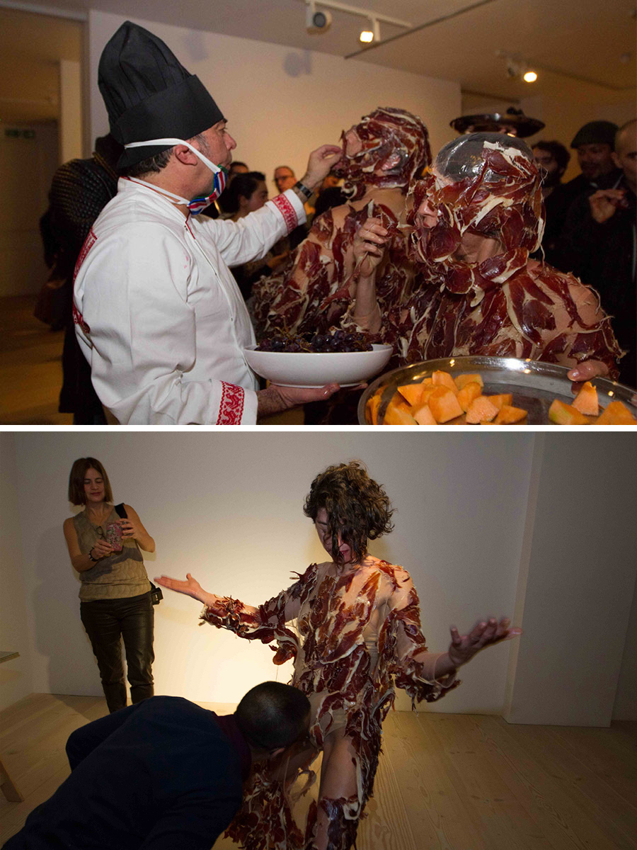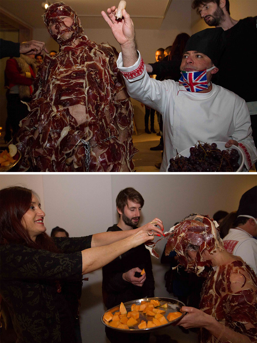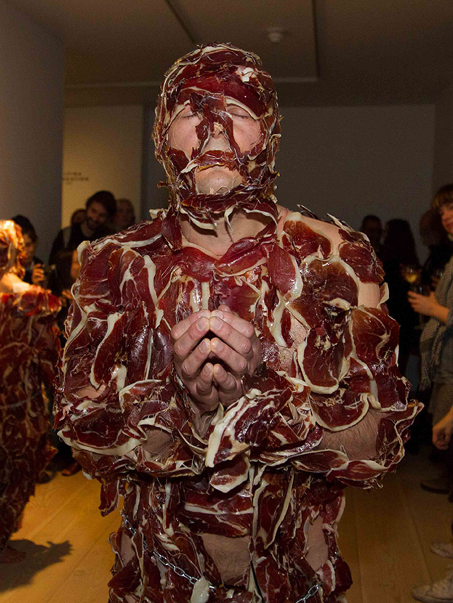 This performance piece aims to recreate this sacrifice through two individuals dressed in suits made of strips of serrano ham, which are offered to the audience to eat at the end of the performance.