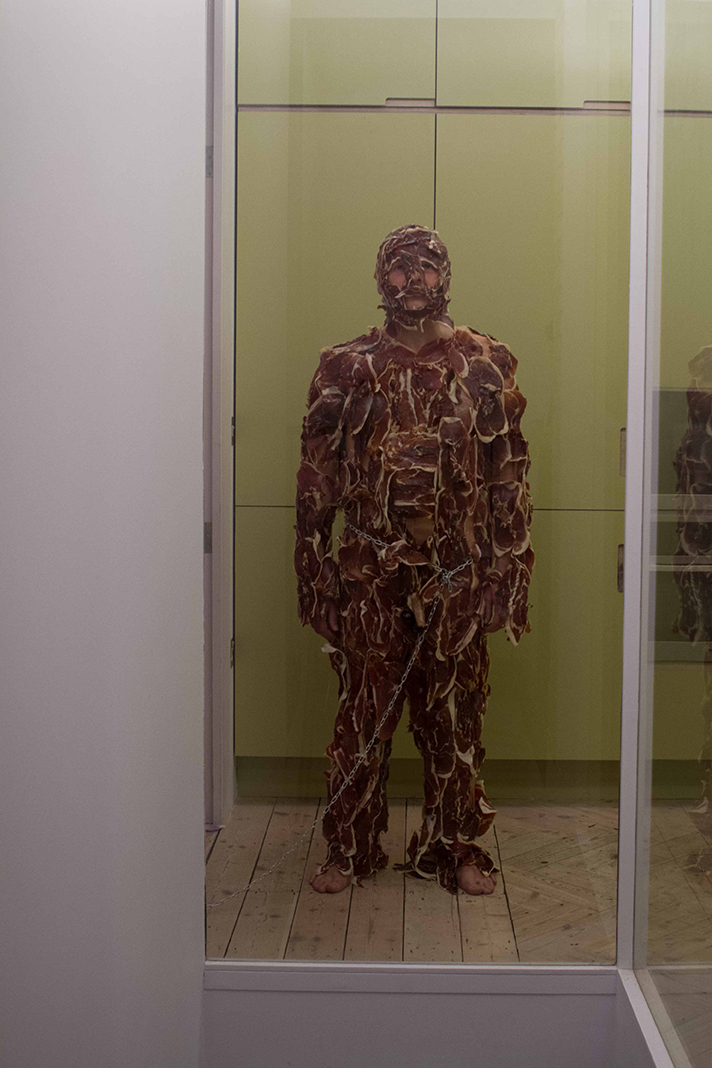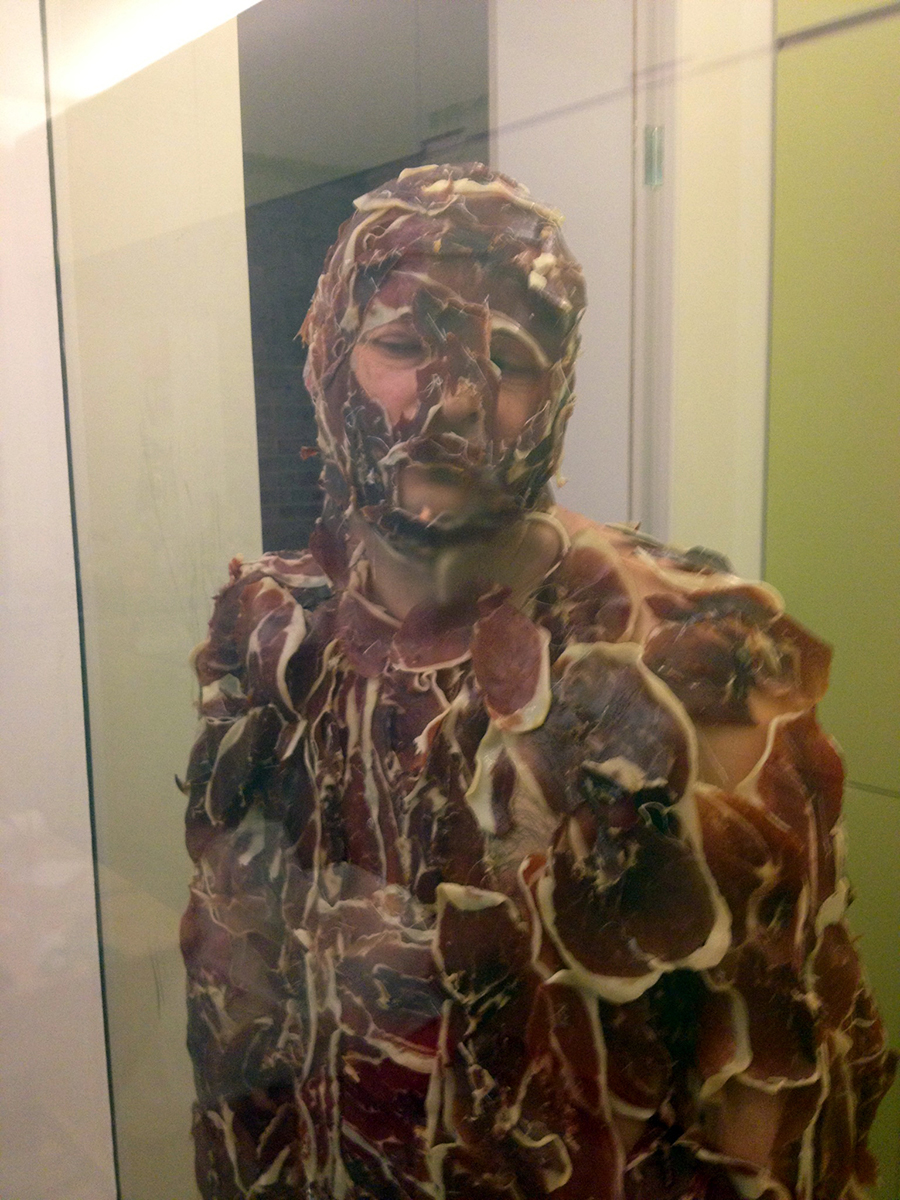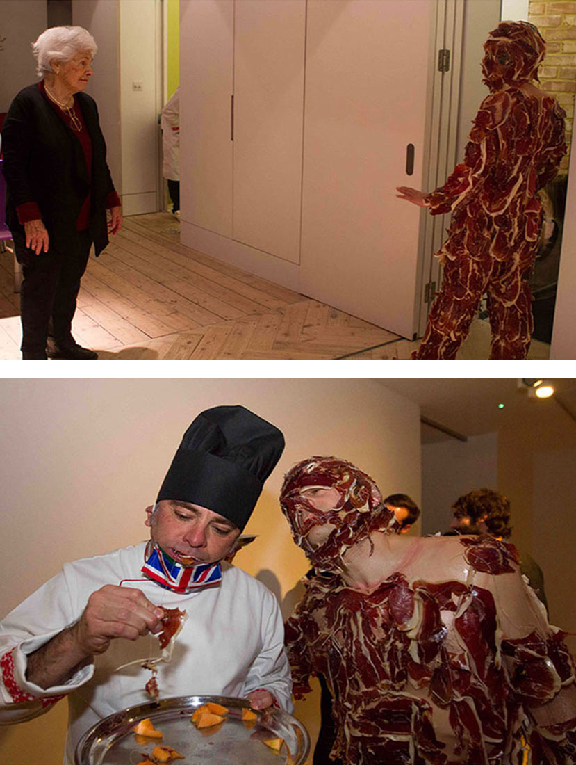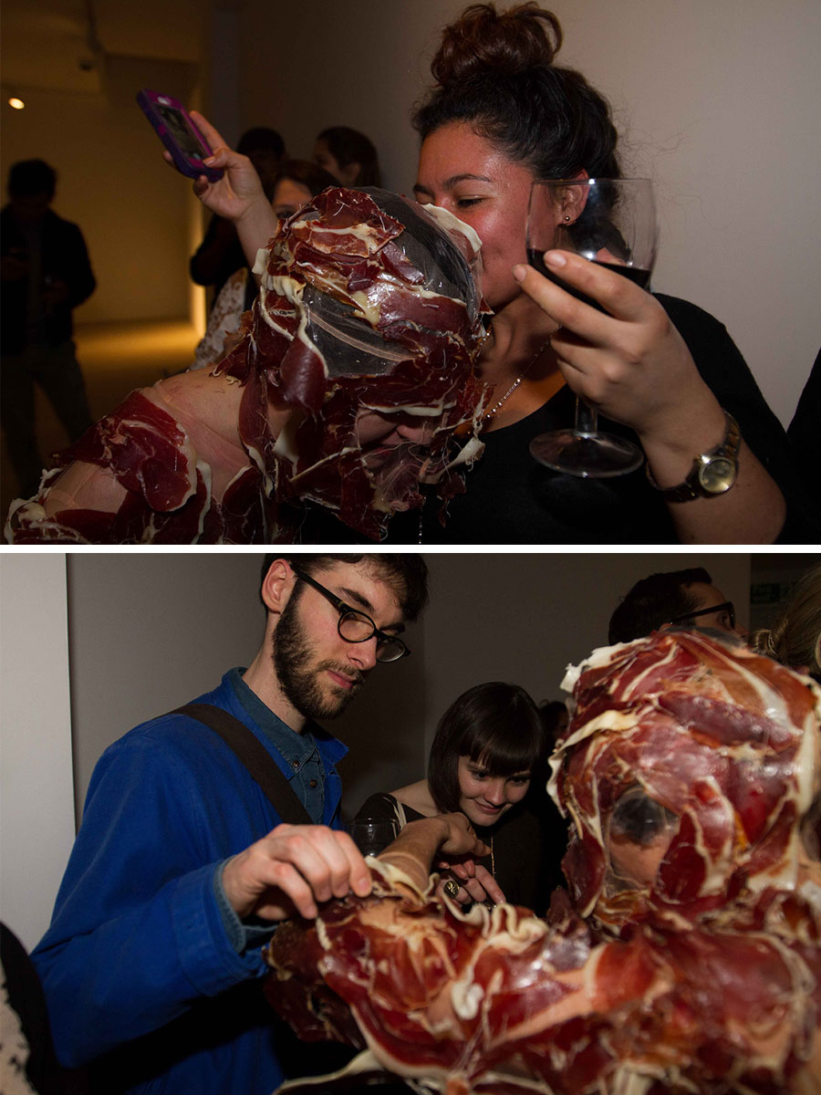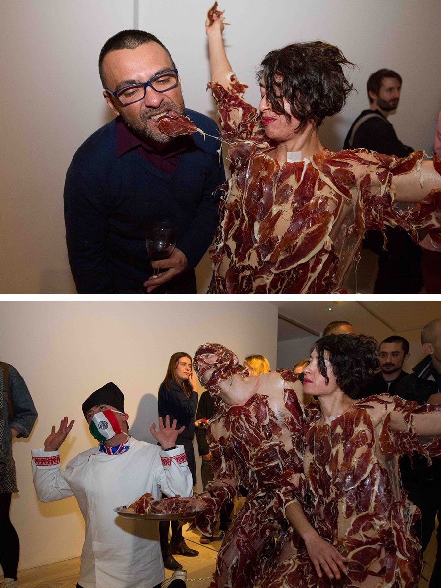 This performance piece aims to recreate this sacrifice through two individuals dressed in suits made of strips of serrano ham, which are offered to the audience to eat at the end of the performance.