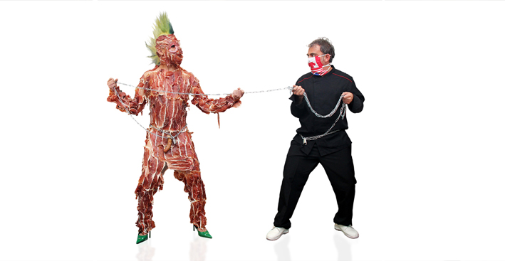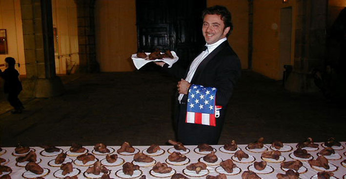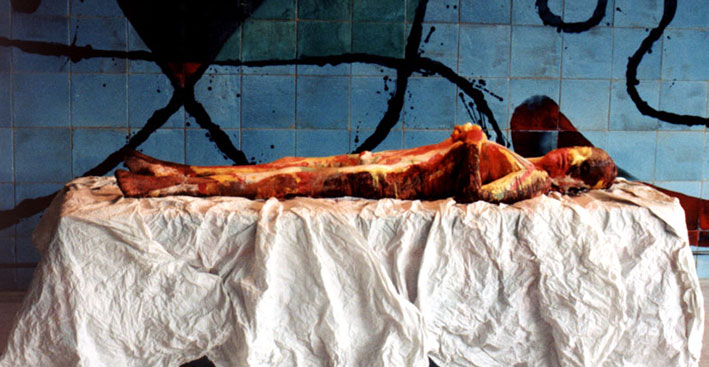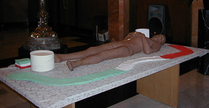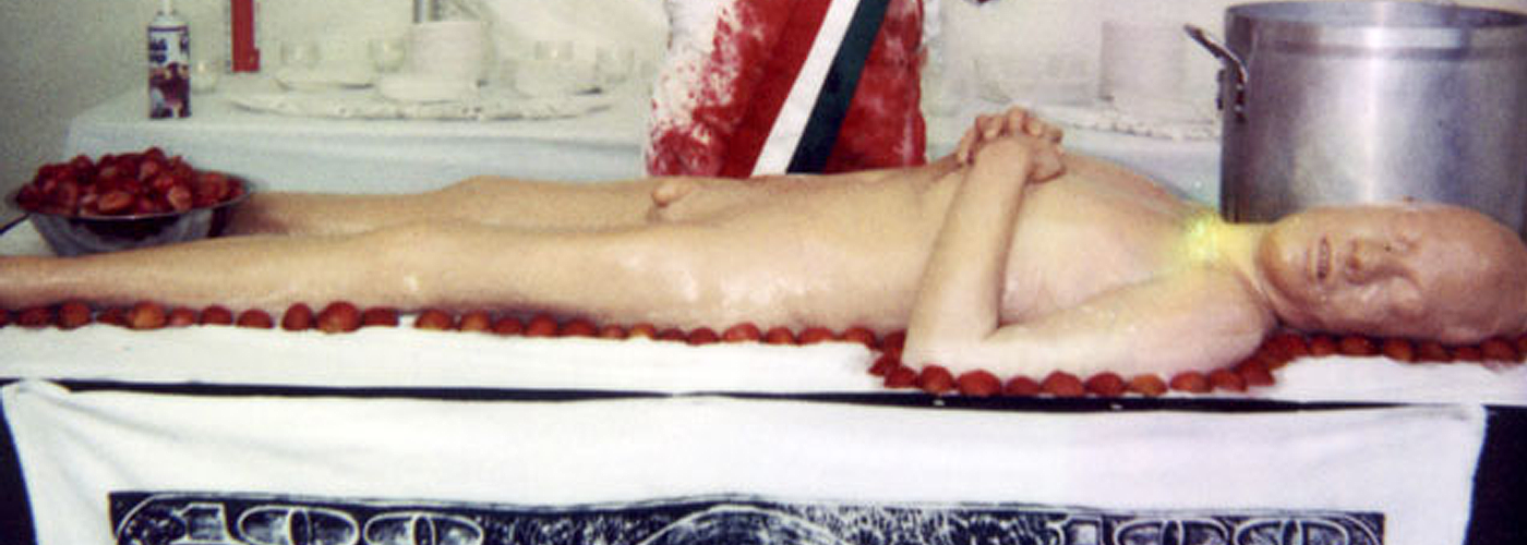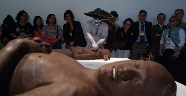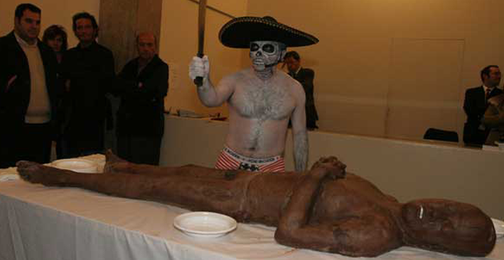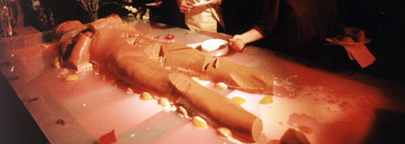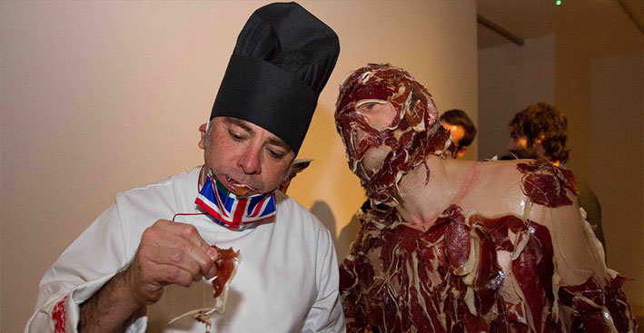 Human chocolART sculpture that the audience ate until only crumbles remained. Mexico, 2001.