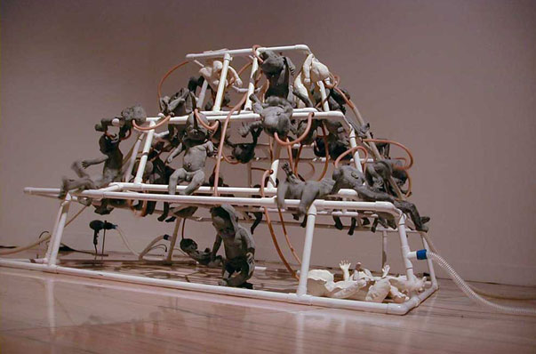 50 esculturas de bebés de caucho vulcanizado que se inflaron y desinflaron cada 30 segundos en una estructura piramidal para evocar la inflación demográfica, la globalización de la población.